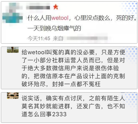 就在今天,腾讯官方给出回应:外挂软件”,是他们一直在加强打击、重点治理。外挂软件不仅破坏了微信平台的生态平衡和正常运营,还为恶意营销行为提供了便利条件,对正常用户造成骚扰。可见,Wetool的根本问题,是违背了腾讯的价值观。这场风波最终结果是wetool的用户被导入进企业微信。腾讯当然希望企业把沉淀在微信上的客户资源,迁移到企业微信上。但这个做法不仅仅是为了扶持企业微信,也是对正常微信用户体验的维护。