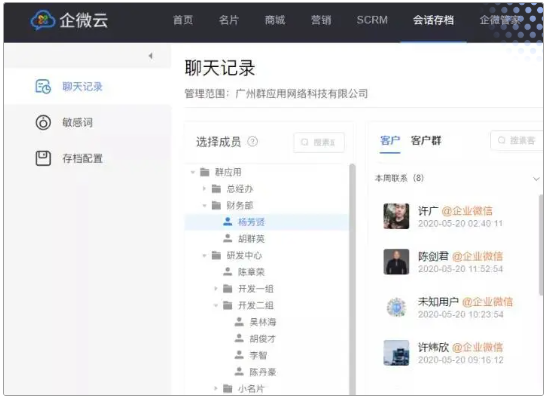 企业微信的员工对外沟通时,一言一行都对企业品牌带来影响。如果没有监管,客服可能会辱骂、拉黑咨询的用户,也有可能自己做私单,转移客户资源。企微云围绕这个痛点,提供了聊天内容实时存档。原来员工手上加了多少客户,具体是怎么服务的,一旦出现争议,可随时调取查看。