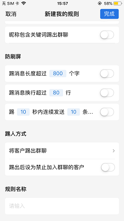 群内最让人讨厌的行为之二就是毫不顾及他人感受不停刷屏了!企业微信客户群防刷屏功能,可以踢除消息长度超过一定字数(最高2000字),或换行超过一定行数的人(最多200行),还可设置踢除/警告特定时间内连续发送多条信息的成员。