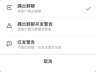 针对前两种踢人方式,群主/群管理员还可将踢出后的群聊客户设置为禁止加入群聊,即将该客户加入黑名单。此时如果该客户再次入群,将会被立马动移除。这个功能真是非常棒!对于屡教不改/多次触犯群规还好意思再进群的人,这样的处罚可以帮群主大大节省群管理成本。不过这个功能也是挺狠的,还是建议谨慎开启哦。