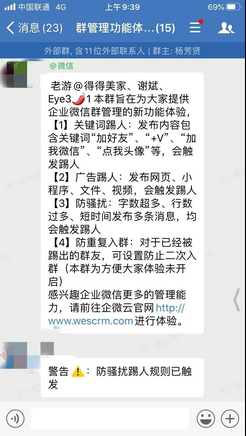 这次的重磅更新主要是防骚扰,由成员设置规则。在客户群开启防骚扰后,如果群客户触发规则,将会被自动移出群聊或被警告;以后终于有办法对付群内乱发广告的牛皮癣了!