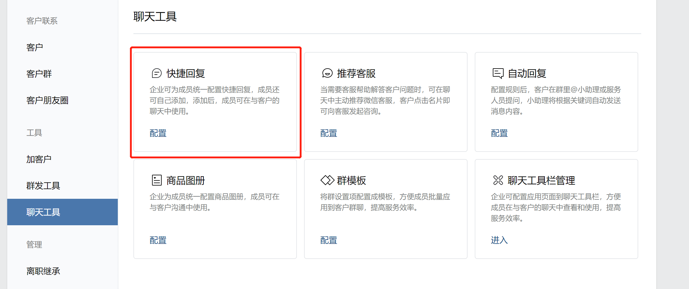 企业微信的话术库对应的是快捷回复功能,打开与客户的聊天框,点击输入框上方栏的最右边的标志,就可以看到快捷回复。管理员或者员工都可以在快捷回复中创建话术,创建成功后,员工只需通过聊天侧边栏的【快捷回复】,即可给客户发送提前创建好的话术。