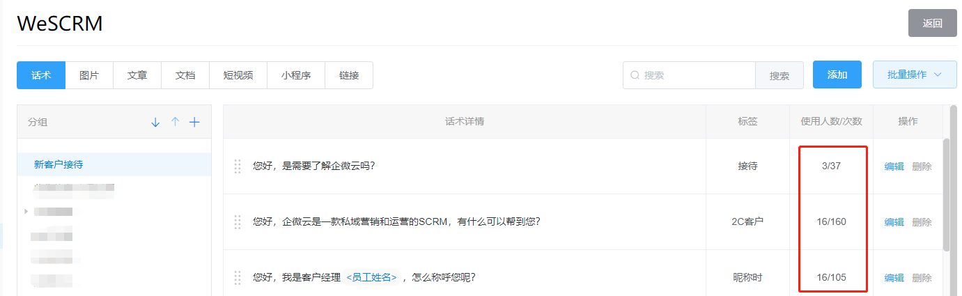 话术库作为一个高频使用的功能,需要持续优化迭代。如果不知道话术使用情况,企业不知道如何迭代,也没办法监控到话术是否有规范使用。