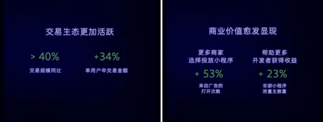 过去一年,小程序月均使用天数增长了 24%,使用时长同比增长 2 倍,和视频号一样超过朋友圈使用时长。整体交易规模达数万亿元,同比增长超过 40%,单用户年交易金额同比增长 34%。