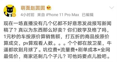 从中提取几个关键词的话,低价直播带货的第一前提,无论是李佳琦、薇娅,都在遵循“全网最低价”的法则。此外加入直播带货清单的门槛也相当高,除去坑位费和佣金后,留给商家的利润看起来并不是很乐观。也许忙乎了半天,商家最终只是赔钱赚吆喝,不得不像罗永浩一般自嘲:“不赚钱,交个朋友”。
