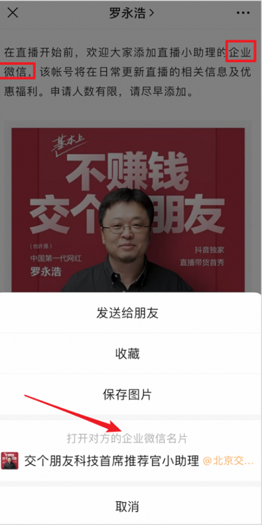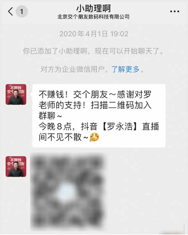 老罗在我眼里一直是个满嘴跑火车的角色,十句话里只能听半句。但当他把二维码挂出来让人加助理企业微信的时候,我明白了他是真的想要“交朋友”。