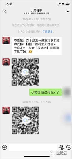 利用欢迎语引导用户加入到社群,然后在社群内部做统一管理。比如李佳琦小助手、罗永浩小助手们的欢迎语,都是直接引导用户进入到社群中。接下来的用户转化场景,就移步到社群中了。