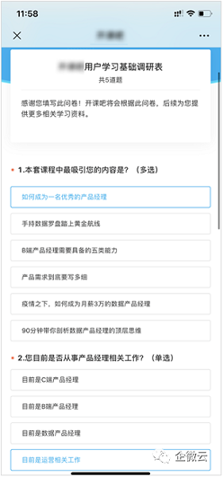 利用企业微信做私域营销的一个关键就是:用户对你的信任,以及你对用户的洞察。第二个技巧是在欢迎语中,通过“文字+网页链接”的形式给新用户发送调查问卷,根据用户填写的问卷结果,完成用户画像,做用户的精细化管理。 比如某线上教育机构班主任的欢迎语,就是一段文案加上调查问卷链接。