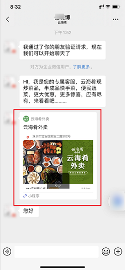 企业微信的对外名片是用户对我们的第一印象,让用户清晰地看到业务员的企业简称、实名认证等信息,加强用户的信任感。除了解决了用户最基本的信任问题之外,很多人忽视了名片还是一个重要的变现入口。 因为企业可以设置名片的自定义对外展示信息,自定义展示信息中可以添加文字、网页(H5)链接、小程序。比如餐饮业,可以在名片上的对外展示中添加了线上商城、外卖小程序,用户可以直接通过业务员的名片,直达这些“可以花钱”的地方。