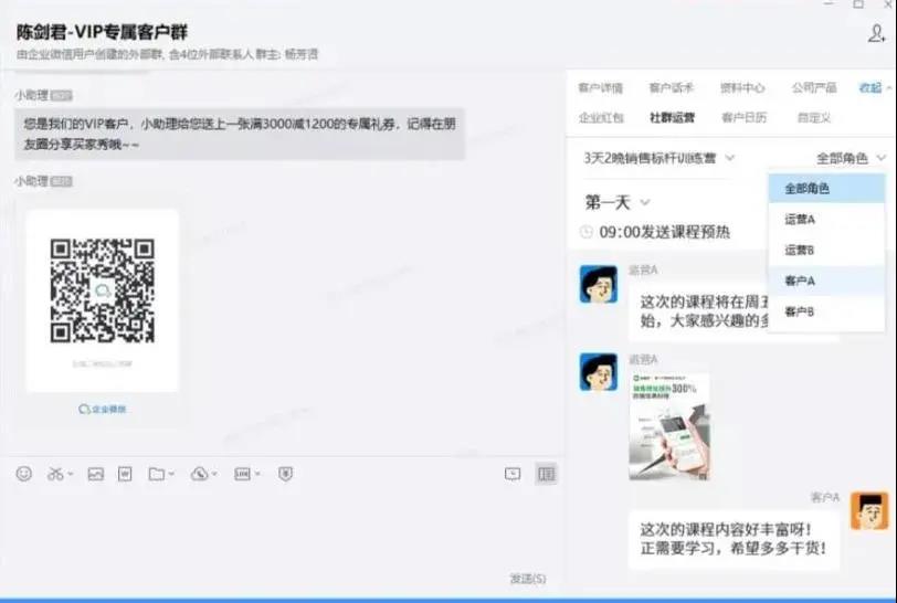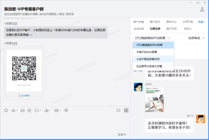 群聊侧边栏可以清晰看到每个群内用户的发送消息数量、时间、内容等信息。对于活跃的用户,导购可以进一步推荐成为付费的常年会员。