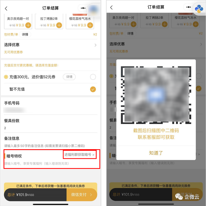打开乐凯撒的点餐小程序,下单界面有一个“暗号特权”模块,拥有特权的话,本单可以免费领一份小食。用户只要扫码添加工作人员的企业微信,加入企业微信群,即可在群公告中获得暗号,暗号及赠送小食都会不定期更换。