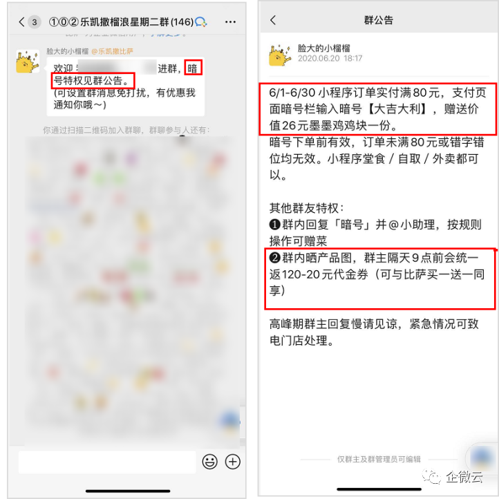 用户进群后,群里会自动弹出欢迎语,引导用户看群公告,在群公告中领取优惠券。