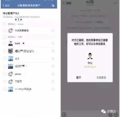 除了产品服务本身,流失还受其他层面的影响,比如销售离职带走客户,不当言论导致客户流失等。这些痛点都将在企微云被解决。首先,企业微信客户池的用户皆属于公司资产,销售离职时将一键交接,将用户无感转移给新业务员。