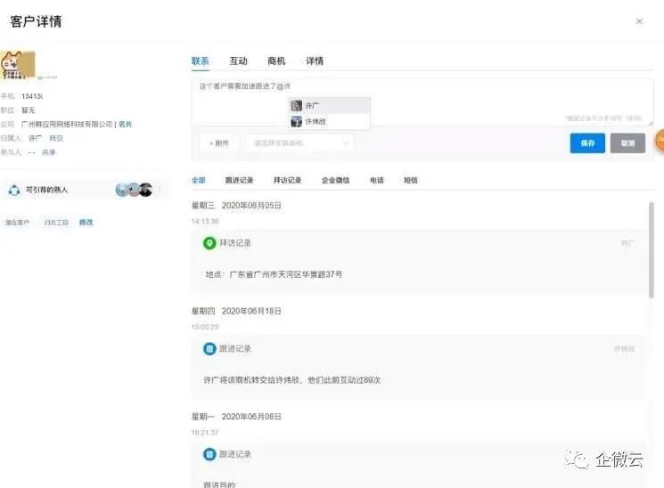 企微云SCRM中的跟进记录帮助销售有计划的安排时间和跟进流程。管理员、运营者及部门上级查看可以直接给成员的跟进记录添加补充,并且@成员,将指令与辅导迅速下达。
