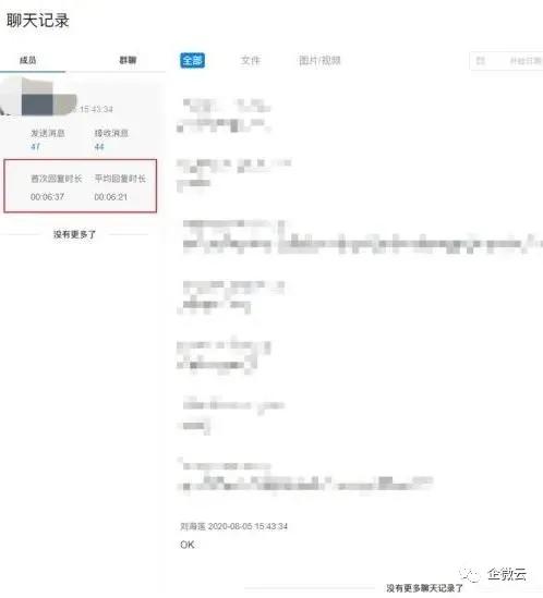 另一方面,聊天记录支持展示回复时间统计,发送与接收消息数统计,帮助管理者监督销售有没有及时回复每一名客户,保证沟通的时效性。
