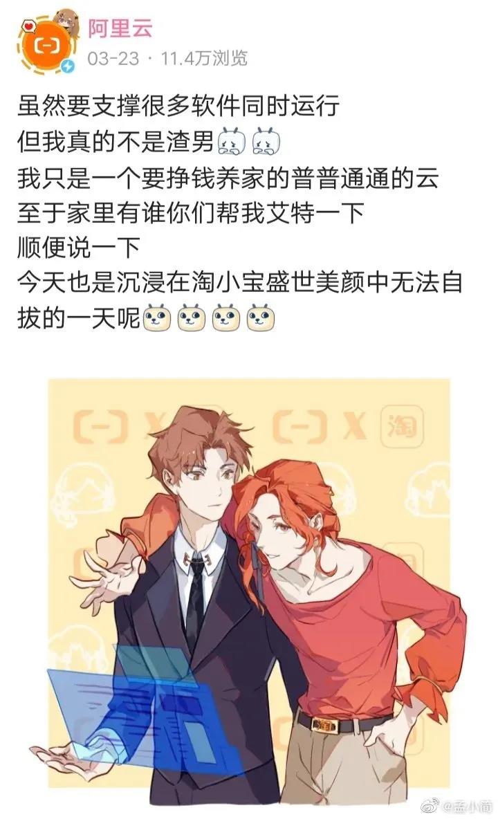 顶梁柱嫡长子淘宝,蠢萌天猫、老实人屁股脸盒马,霸总支付宝、挣钱养家的低调程序员阿里云……广大网友嗑的不亦乐乎,还开启了在B站看阿里家族爱恨情仇的潮流,什么九子夺嫡,父慈子孝,政治联姻……