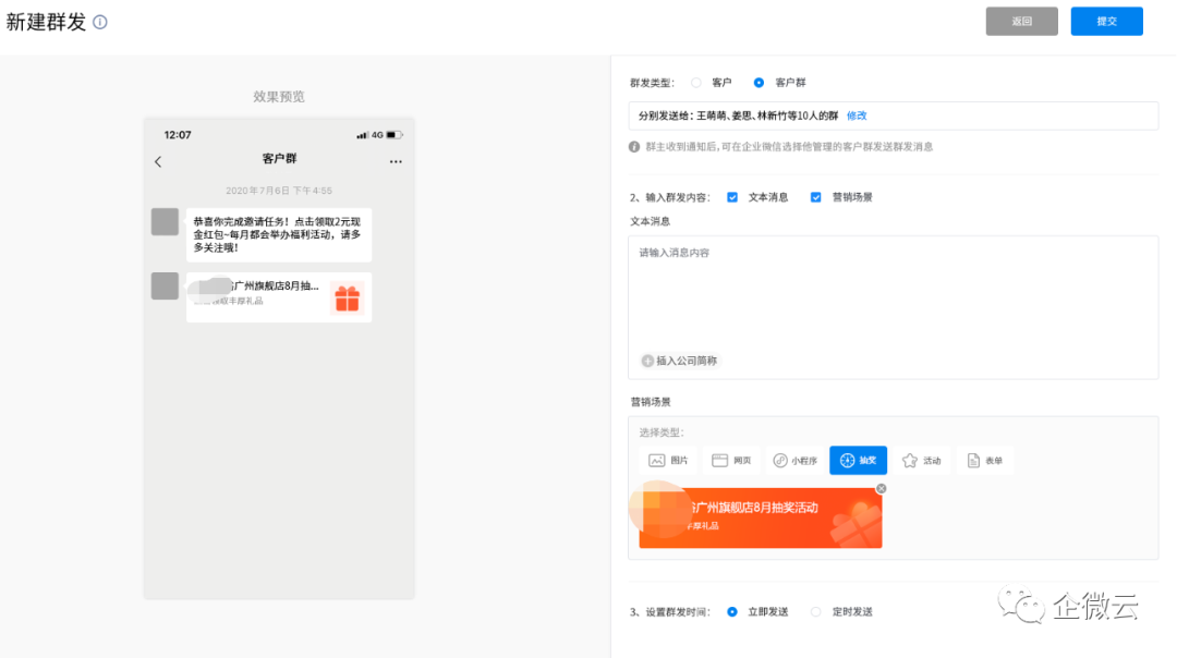 上个月,健身房计划做线上课程试听课,企微云给他们建议,为了让直播间更有人气,可以通过公众号和企业微信群发同时向客户发送直播预告。