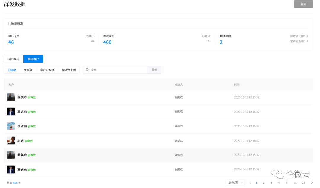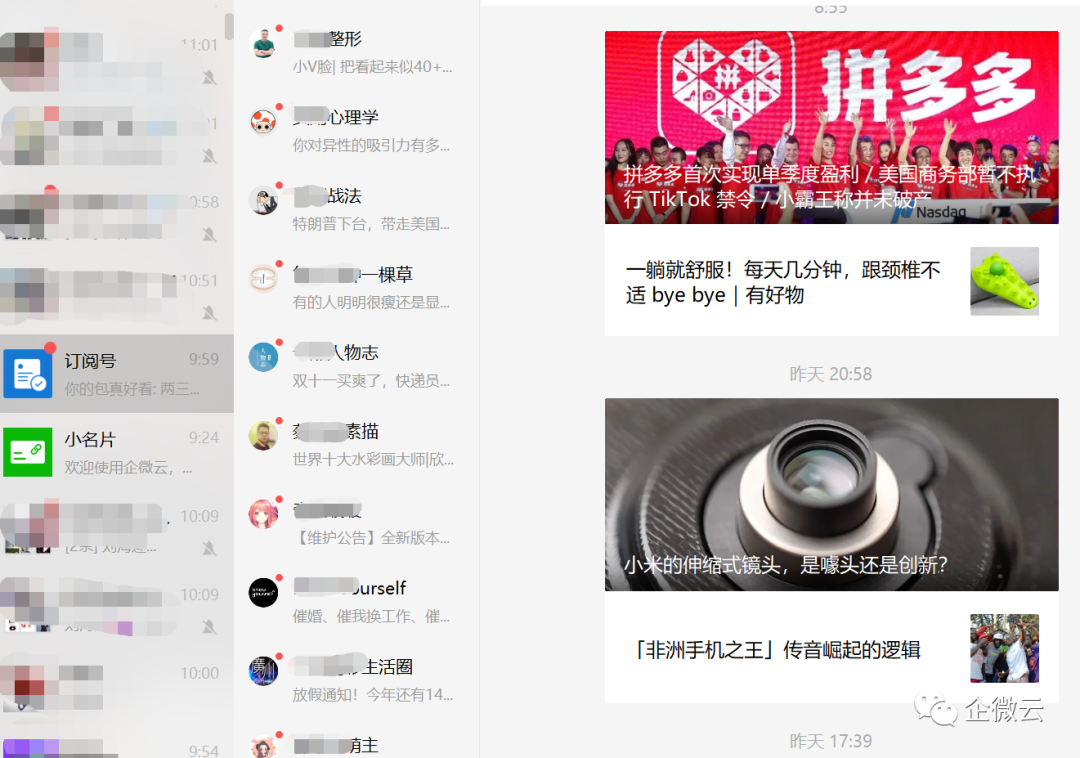 合适的触达渠道 我们服务的一个健身行业的头部客户,过去也跟大部分企业一样,养着小编佛系的运营公众号,有热点就追,平时KPI就是文章的打开率、阅读量、转发率;但真正到活动、课程通知的时候,转化却低的可怜。 结果出乎他们的意料: 50000个公众号粉丝收到活动消息,最终只有 150 +人进入了直播活动群; 10000个企业微信上的好友推送了同样的消息,竟有 760+ 人加入了直播活动群。 如果按比例来算,企业微信的触达效率比公众号高出了 25 倍。 这个数字其实并不意外,试想一下,就算是一个你经常阅读的公众号,推送的内容你会一篇不落的打开吗? 但如果是好友发给你的消息呢? 对于企业来讲,有时候我们数据不好,活动参与度不够高,很可能不是因为内容不好或者粉丝没需求,而是没有选择好合适的用户触达渠道。对于产品更新、活动预告这类通知类信息来讲,企业微信群发的触达率无疑比公众号更高效,原因有二: 1.客户收到我们企业微信的推送时,在客户微信端就跟普通好友发来消息的呈现是一致的,不会下意识忽视; 2.公众号分为订阅号和服务号,订阅号推送会被淹没在订阅号的信息栏里; 订阅号消息繁多杂乱 而如果客户是从服务号收到推送,往往也认为是营销或者广告信息,默认采取的是忽略的态度。 并不是让大家放弃公众号,公众号和企微客户池一定是要结合的,企微群发的影响力是瞬间的,而公众号属于厚积薄发,有更长尾的曝光。微信生态的各个工具各司其职,企业应根据内容性质和目的选择最合适的触达渠道。 精准筛选 个性触达 群发获得效果后,健身房有了更高的需求,他们想面向减脂和增肌需求、并根据会员健身阶段、消费水平的高低,分别群发不同的课程预告。这要怎么操作呢? 企微云的群发功能在企业微信原有的能力上做了增强,可以根据添加时间、添加的渠道、标签分层等多个维度来筛选客户,做到个性化的消息触达,并且支持植入多种营销场景如红包、小程序、抽奖插件等。 现在这家健身房每次在直播预告前,都会先群发一个抽奖进行预热,奖品包括送运动水杯、课程代金券等,每分享给一个好友还可以再获得一次抽奖机会。不仅可以在活动前提升用户活跃度,还通过社交分享带来了更多的关注。 发送效果尽在掌握 在公众号推送一篇文章,除了阅读量这个数据外,其他的效果都无从获知。布置公司成员转发文章到朋友圈的任务,结果员工发了“同事可见”。而在客户一侧,究竟谁打开了文章、谁对产品有意向,公司都不清楚,也不能触达客户。 而企微云的群发功能不仅可以查看企业成员发送情况、客户的接受结果,谁看了、看了什么也一目了然,并且可以推送提示销售人员。 今天你群发给客户发送一份文件,有些客户当时可能没有反应,过了几天突然点开了,如果是平时你就白白错过这么好的机会。 但开通企微云后,客户打开文件会第一时间给你发送提醒通知,在聊天侧边栏也会显示客户的浏览内容、时间等信息,抓住时机和客户进一步沟通,就有更高的转化可能。