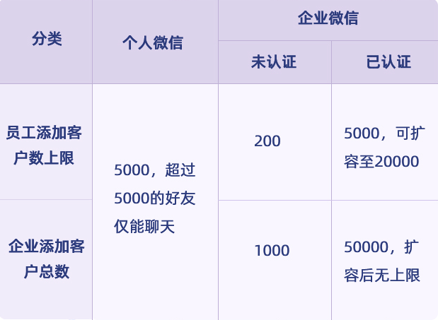 个人微信好友默认5000人,超过5000好友外的“好友”,只有仅聊天的权限。经过认证的企业微信号,每个员工最多可添加和服务2万个客户,企业总客户数无上限。
