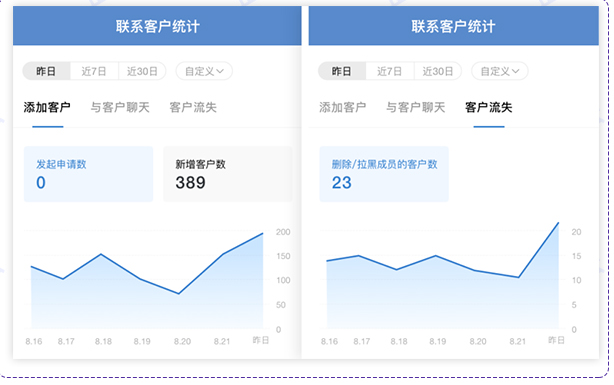个人微信管理跟进客户,每天客户的新增、互动数据都无从得知。企业微信自动统计新增客户数、聊天总数、删除/拉黑的客户数等数据,并且可以导出进行数据分析。