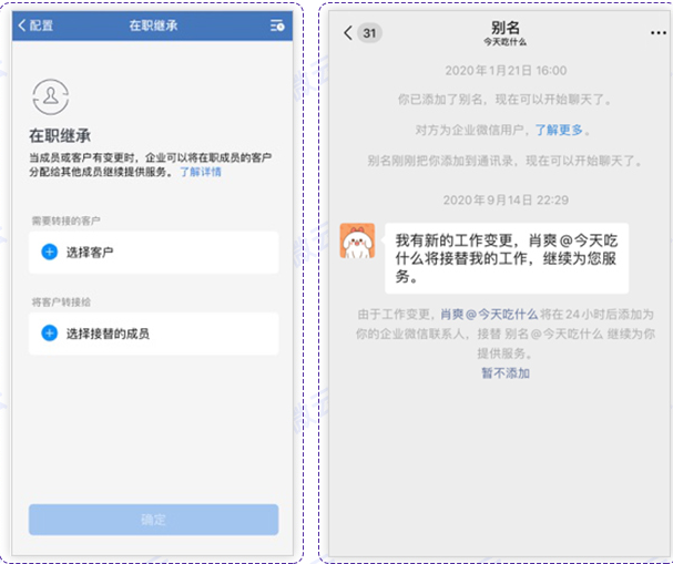 微信不能共享好友,客户存在员工个人微信,可能随员工离职而流失。使用企业微信添加客户,在服务期间可将客户共享给其他同事一起跟进;员工在职有岗位变动或者离职,可以把客户分配给其他员工,妥善继承,保证服务不中断、客户不流失。