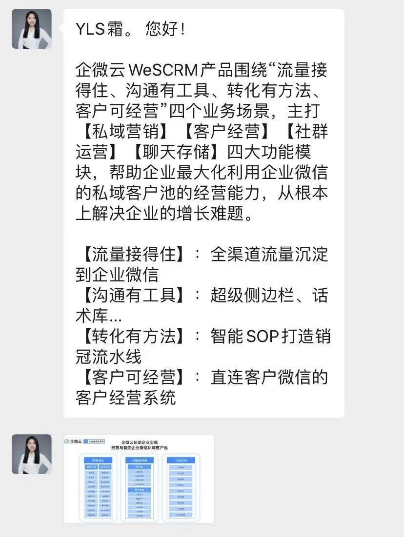 企业微信虽然提供了欢迎语功能,但却只能给企业全员配置同一条欢迎语内容,而实际上企业不同成员、不同岗位、不同运营场景,需要差异化的欢迎语辅助运营。WeSCRM企微云在企业微信欢迎语之上进行了功能增强,让企业能根据不同岗位、角色设置不同的欢迎语。比如针对业务人员,我们可以配置产品介绍相关的欢迎语,帮助业务人员迅速与客户建立联系,沟通破冰;