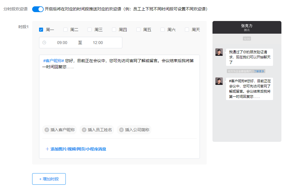 比如每周一上午是销售例会的时间,我们可以设置每周一上午9:00-12:00的时段欢迎语:您好,目前正在会议中,您可先访问官网了解或留言。会议结束后我将第一时间回复您……当这个时间段有客户添加销售企业微信,会自动发出对应的时段欢迎语,引导客户初步了解官网,留言等待,保障良好的接待体验。