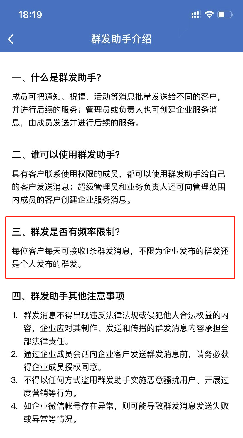 群发消息是营销的有效手段,企业群发消息升级至每天一次,无疑是喜大普奔。但过度营销会让客户反感,导致成员被客户删除、客户流失的情况。