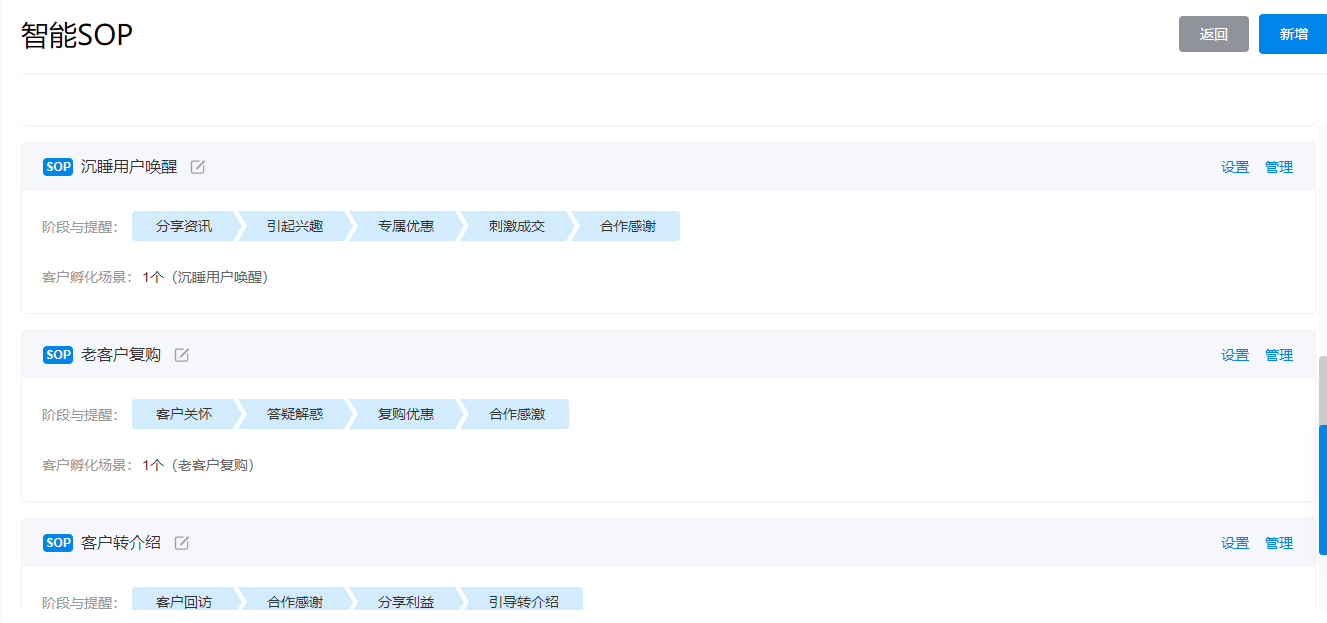 SOP(Standard Operating Procedure),即标准作业程序,对于企业经营效率的提升有着巨大的推动作用。面对长周期、多触点、强运营的私域流量, 通过智能SOP,我们可以将销冠的成功经验应用在所有客户上;我们可以将客户服务流程、话术标准化,提升全员的服务水平;我们还可以智能执行高效运营策略……
