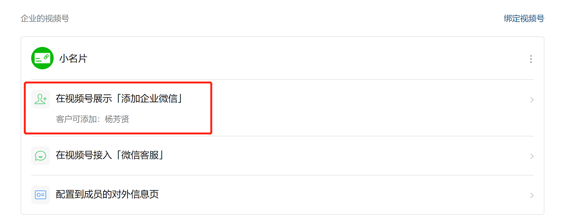 绑定完成后,点击【在视频号展示「添加企业微信」】,设置客户可添加的成员。
