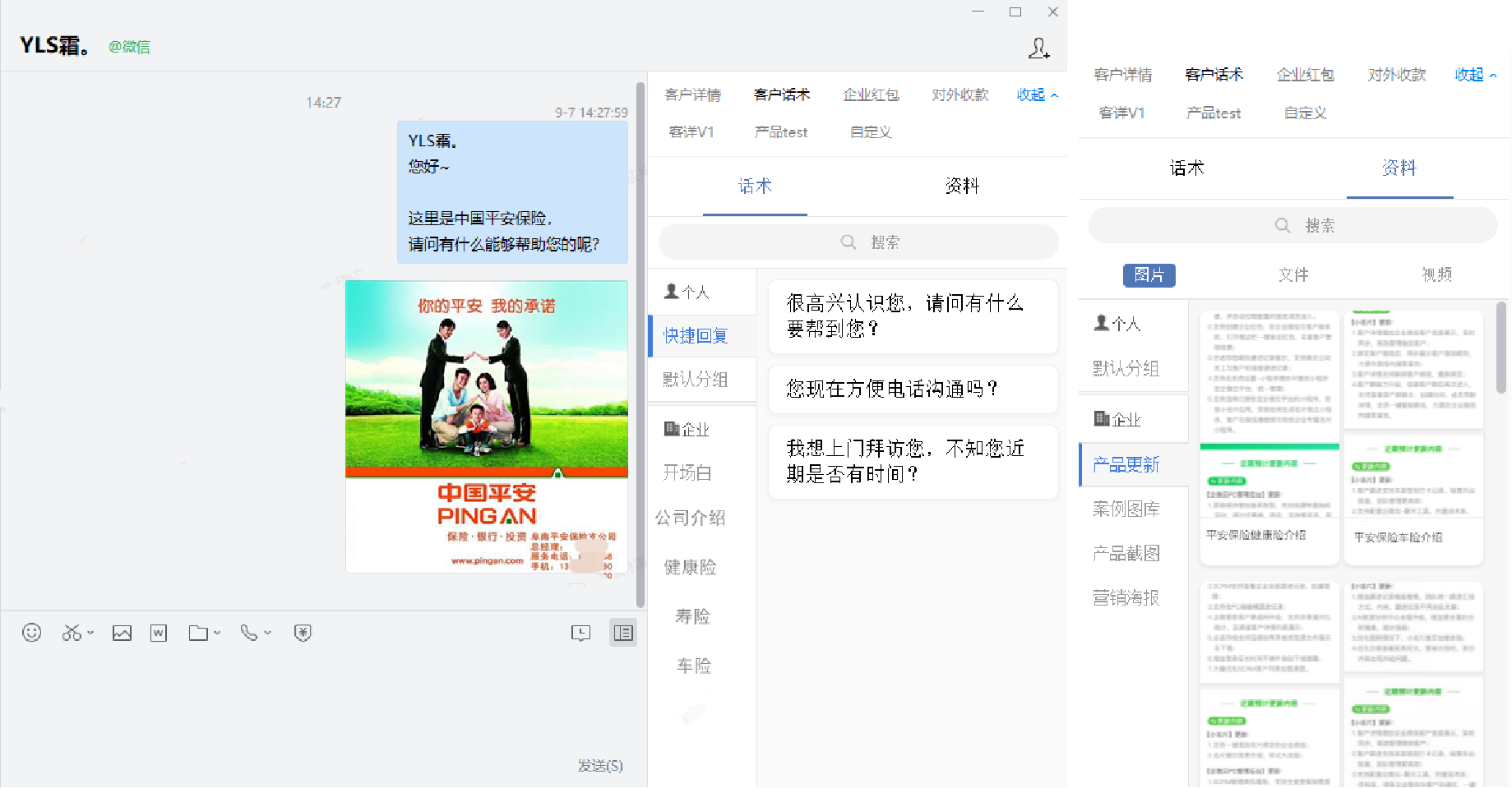 面对新客户对保险产品的疑问,保险代理人可以设置常见问题的回复话术。将话术上传到企微管家【聊天话术库】,在企业微信聊天咨询过程中通过话术快速回复。还可以将保险相关资料上传到【聊天资料库】,提高沟通效率的同时确保标准化的业务解答,为后续签单提供保障。