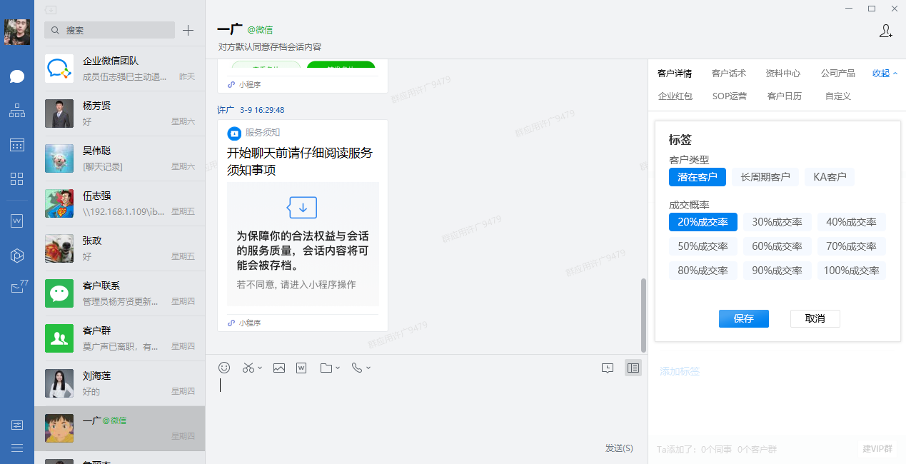 用户咨询过程中业务人员可根据客户咨询内容,为客户打上对应标签,比如咨询健康险,则打上“健康险”“年龄”等标签,方便后续为客户提供个性化服务及精准运营。