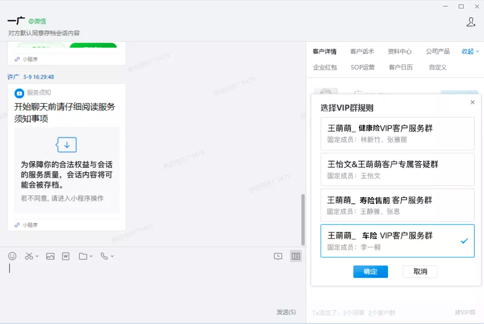 保险行业涉及多种业务场景,以平安车险为例,每次理赔过程都比较繁杂,需要多方参与。通过企微管家【VIP群创建】功能,将现场查勘、客服、核保等人员设置为默认成员,当有理赔服务时,客户经理只需一键拉群,就能让各方参与到消理赔的沟通中,高效快速完成服务闭环。