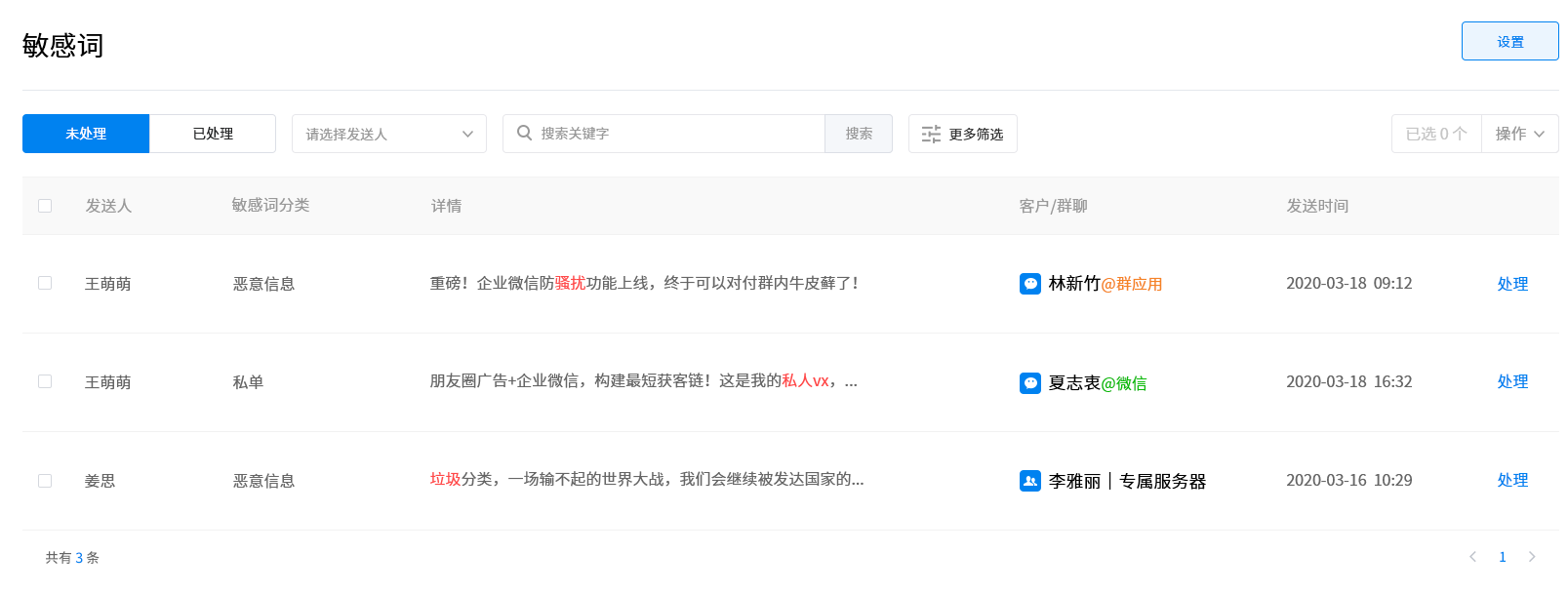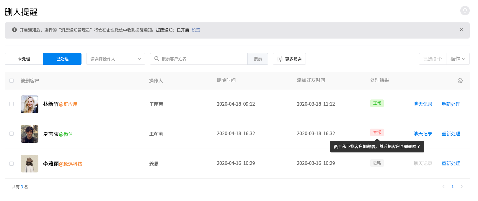 此外,平安保险代理人数量众多,服务能力参差不齐,辱骂、删除客户等行为时有发生。企微管家【敏感行为质检】能帮助企业对风险行为进行预警。比如将辱骂词、回扣设置为敏感词,员工和客户沟通过程中触发时,系统会自动给管理员发送敏感预警。而当代理人有私自删除好友的行为时,系统则会推送删人提醒。管理员可对敏感提醒进行跟踪处理,避免飞单、私单的风险,保障企业客户资源的安全。