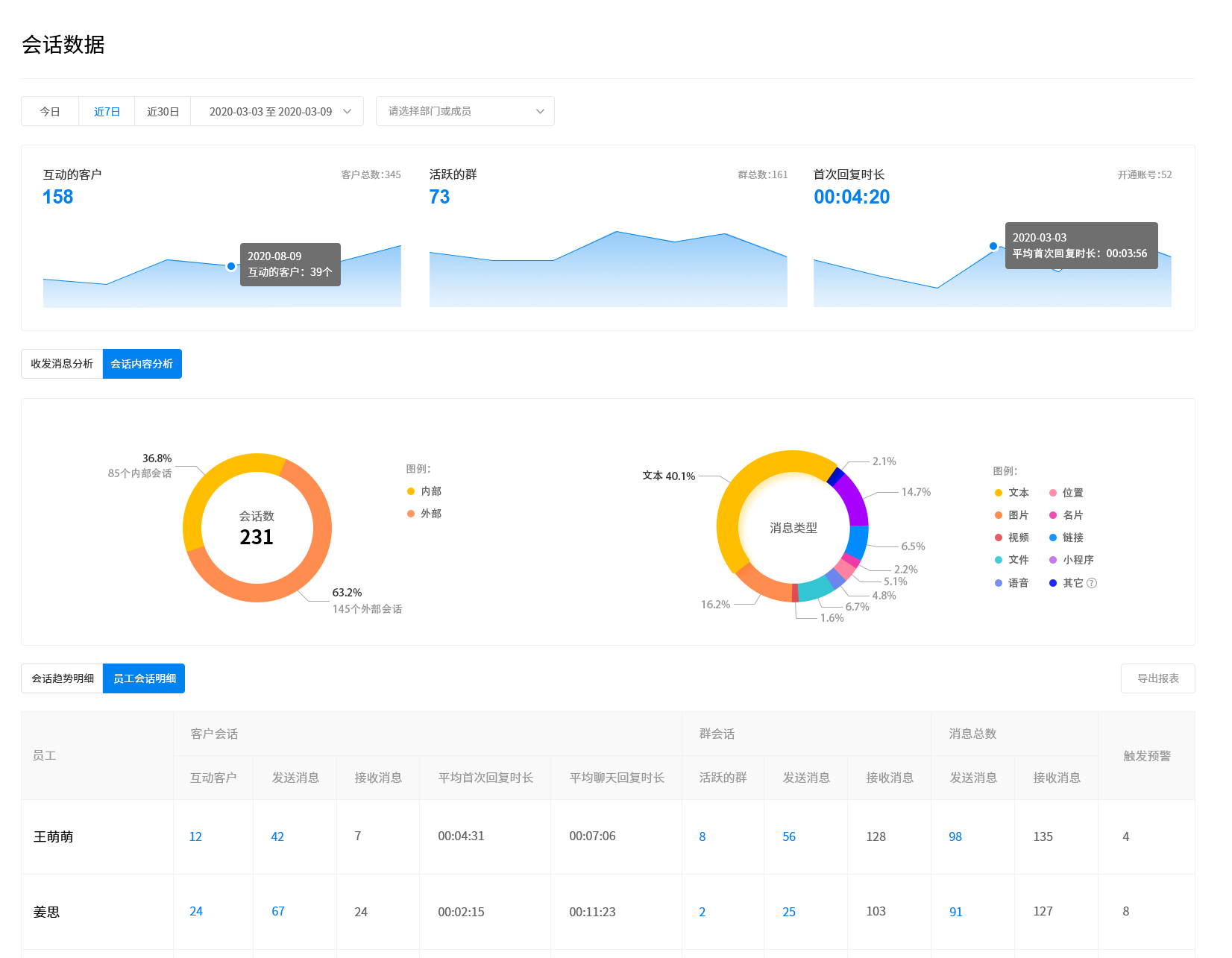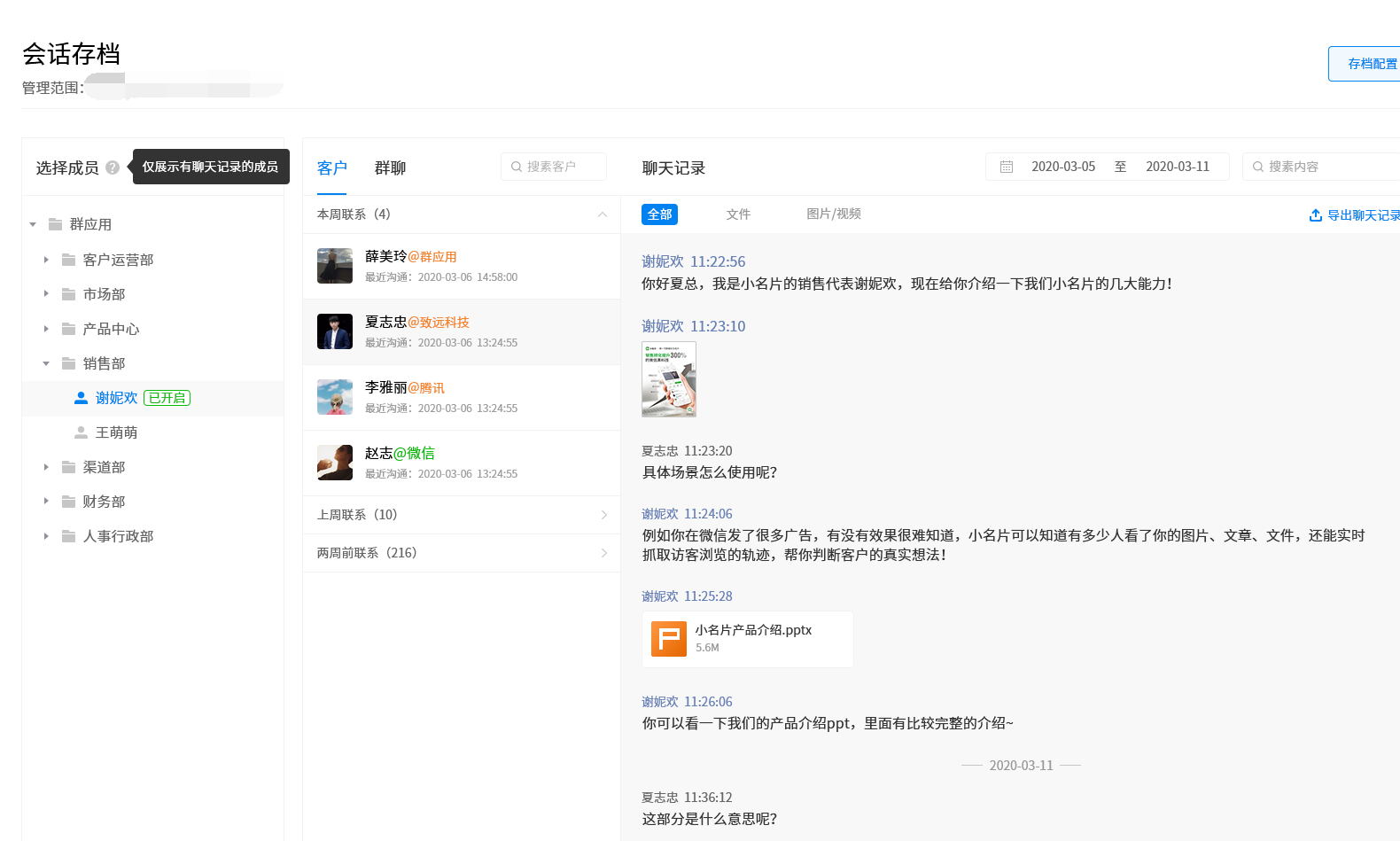 在业务风控方面,企微云【会话存档】能实现对员工的会话监管,提升员工与客户交流的专业能力。自动同步员工与内外部联系人的聊天记录,包括单聊、群聊。管理者可随时抽查业务人员的聊天内容进行话术考查,针对业务能力较差的员工可进行统一培训,提高团队整体业务能力。结合会话数据的统计分析,量化考核体系。