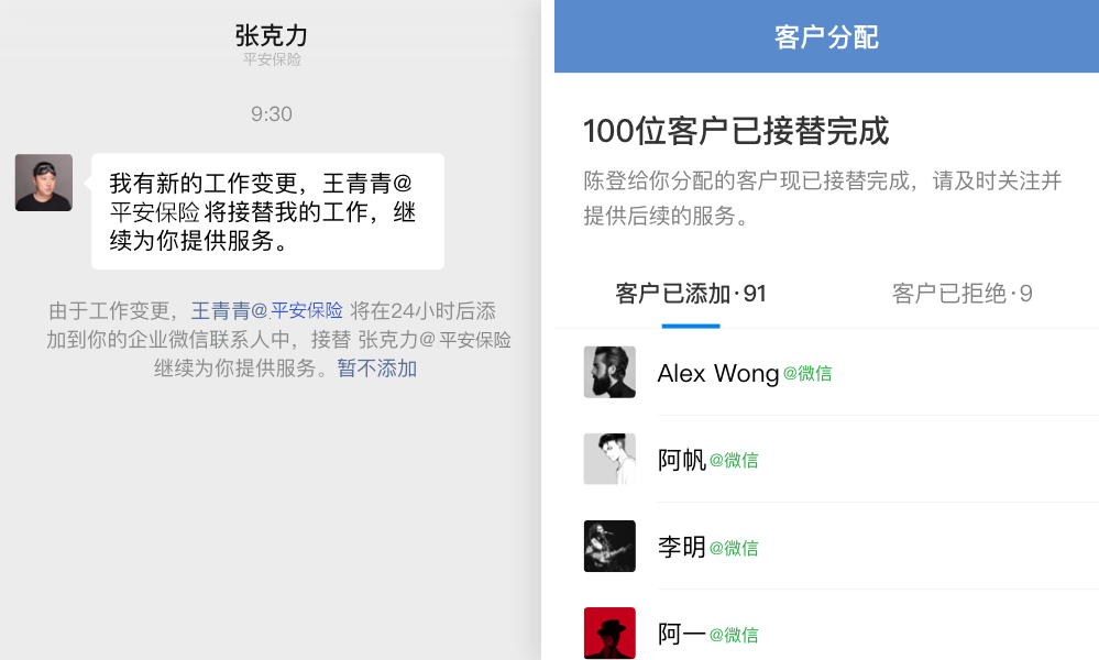 结合企业微信的离职继承能力,当有代理人离职时,平安保险可自行分配离职人员的客户,并将聊天记录、跟进记录等信息同步给交接的代理人,让服务不中断,从而降低客户的流失率。