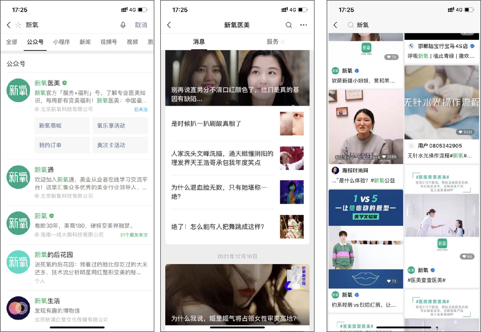 在视频号,新氧医美主要发布三类内容:医美科普内容、医美项目效果展示实录、新氧体验官真实案例。