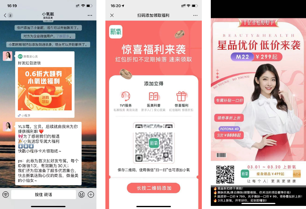 新氧医美通过企业微信,打造了一个“青春”、“美丽”的「新氧福利官」形象。形象的建立,离不开新氧医美优秀的内容产出和私域种草打法。