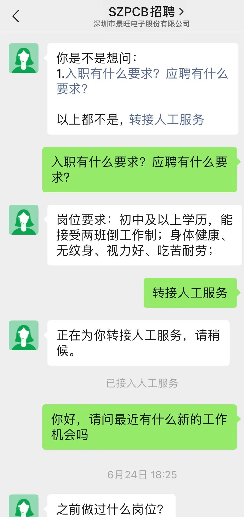以一线招聘为例,过去,景旺电子招聘团队需要到人头攒动的深圳龙华汽车站人才市场招人,现在,景旺电子在微信里就能直接招聘了。景旺电子为HR的企业微信打通“微信客服”功能,建立“深圳市景旺电子股份有限公司”客户服务号。当意向求职者扫码接入后便可以随时咨询。