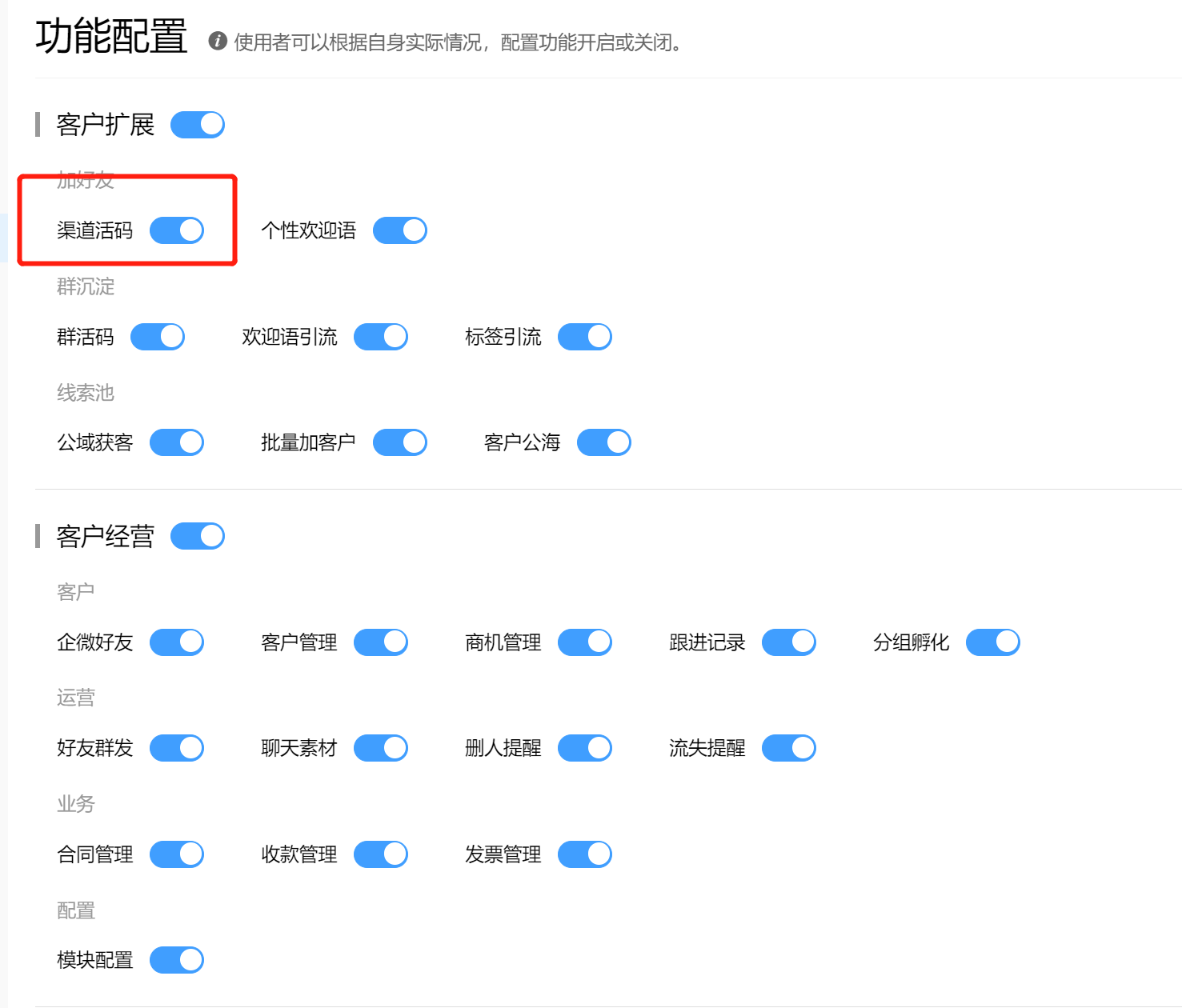 不同成员对企微云功能的使用权限各不相同,比如销售部主要使用客户经营模块,这时就可可以只给自己开启客户经营模块,让系统后台更加简洁。使用者可以通过开关来控制后台的功能,关闭的功能不会在前端显示。