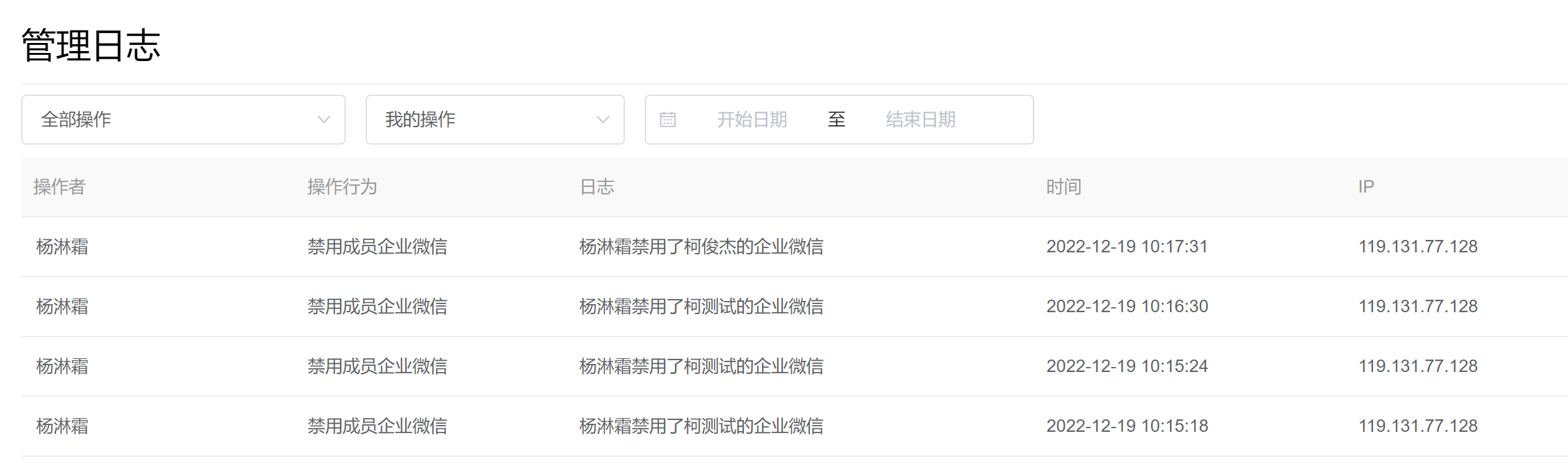 在管理日志模块,企业可以查看到成员在后台操作日志,包括取消授权WeSCRM企微云、取消授权通讯录、修改第三方应用使用范围、编辑成员信息、同步通讯录、离职/复职成员、添加/编辑/删除企业微信标签/标签组。