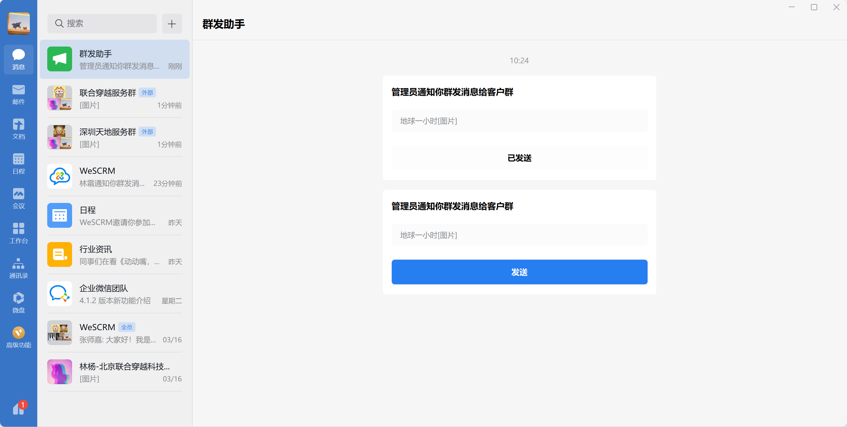 “普通群发”基于企微原生群发功能,创建后执行人将收到企微的群发消息通知,执行人可点击一键发送。受企业微信限制,每个客户群每天最多能接收来自同一名成员的一条群发消息。