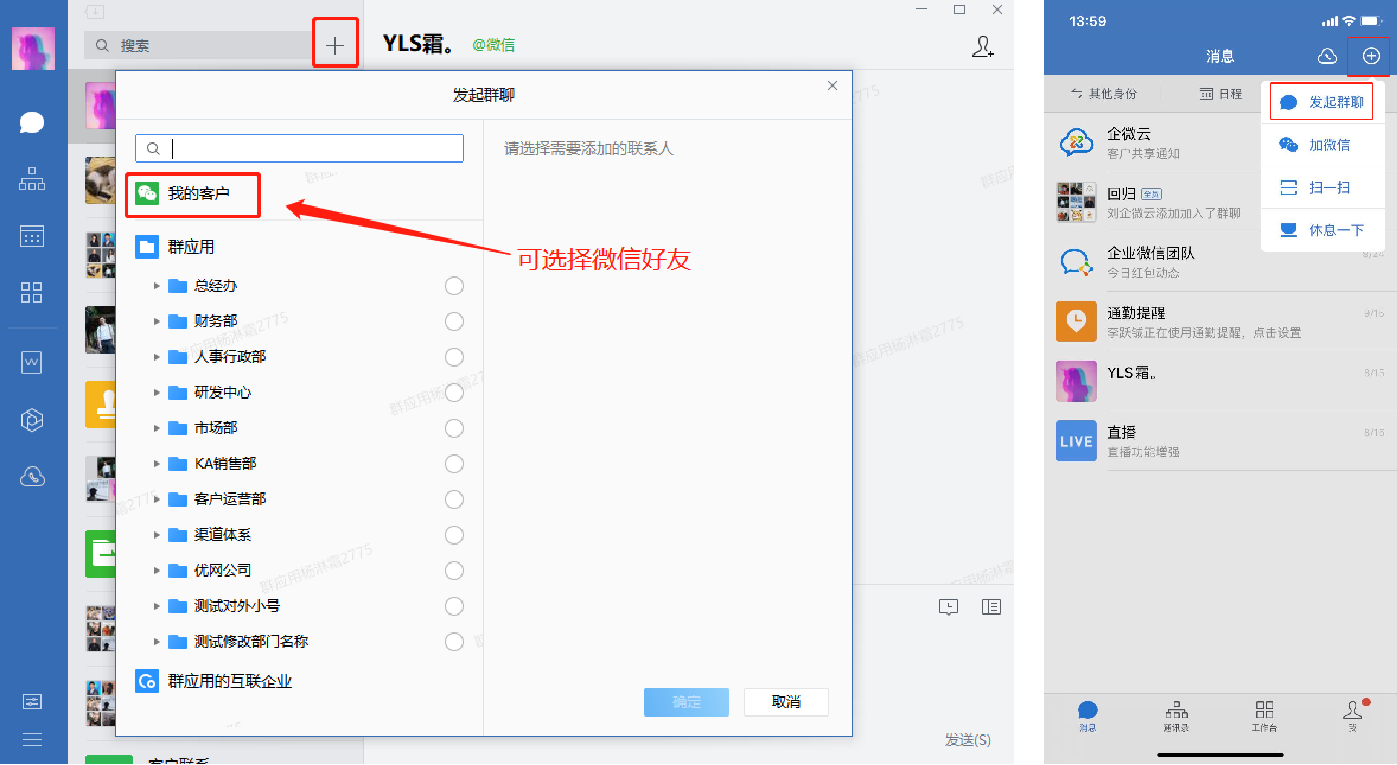 在企业微信客户端或手机端,点击“+”,即可发起群聊。选择想要添加入群聊的成员,即可创建群聊。