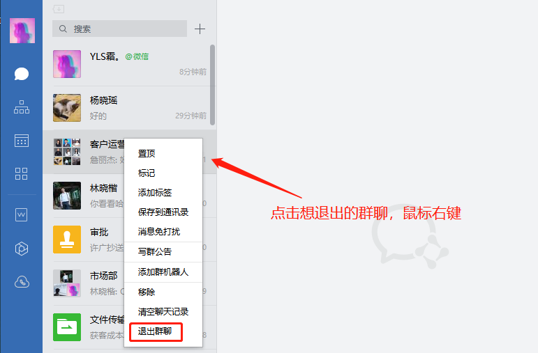 电脑端:在联系人列表,鼠标放在群聊会话框上,右键就可以选择退出群聊。