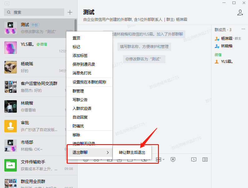 ①当群主退出企业微信内部群后,企业微信会自动挑选群成员成为群主。