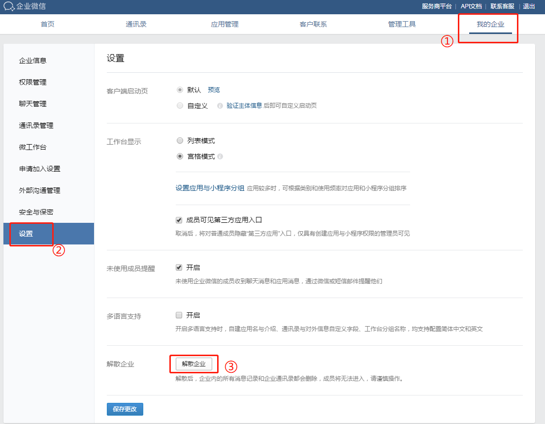 方式一:企业微信创建人登陆企业微信后台, 在【我的企业】->【设置】->【解散企业】。