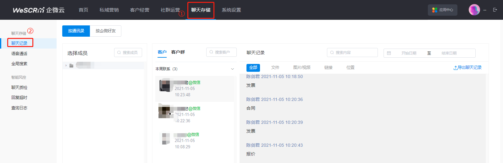 点击进入【聊天存储】页面-选择【聊天记录】版块,即可按照企业成员、客户/客户群等查看企业员工的聊天记录。