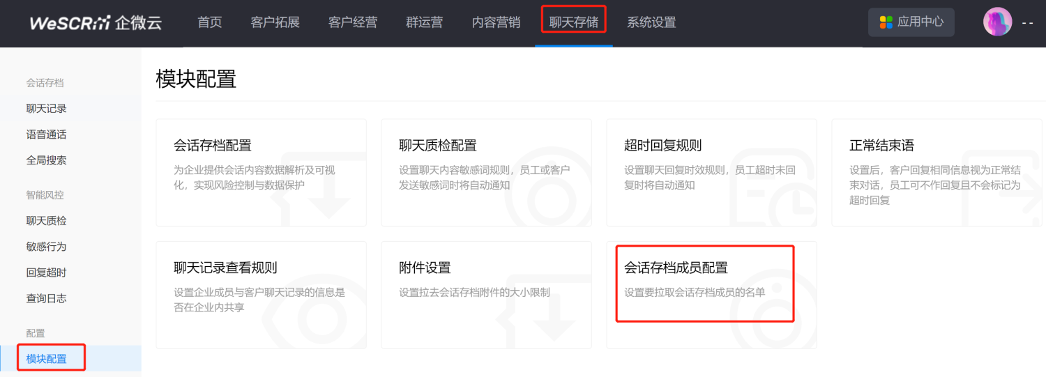 ②登录WeSCRM企微云后台,设置开启范围操作路径:WeSCRM企微云后台-【聊天存储】-【模块配置】(如下图所示操作)