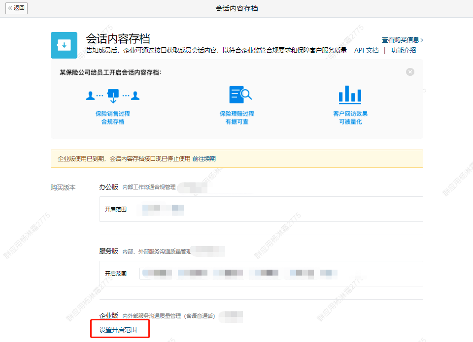说明:企业微信开启范围(成员)和WeSCRM企微云开启范围(成员)必须是一致的,才能获取到该成员与客户对话或者群聊的存档信息。