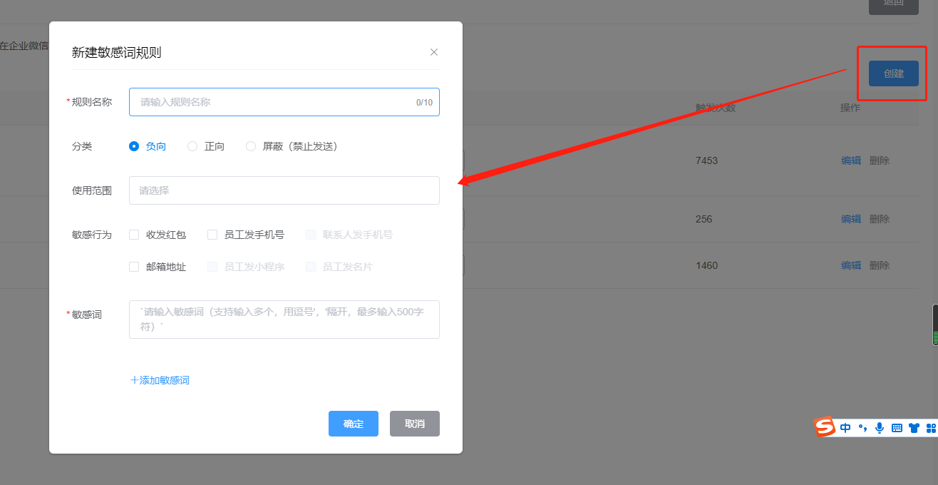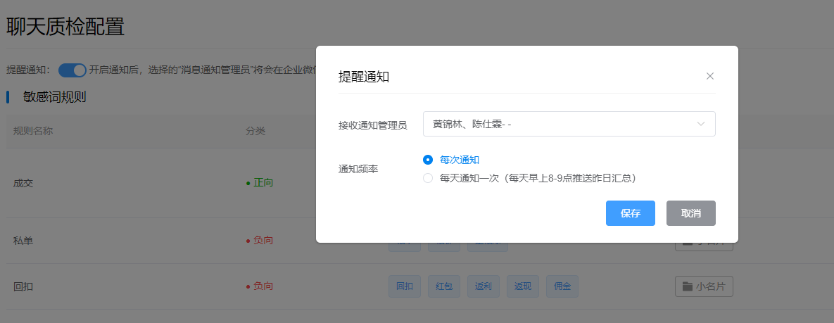 点击创建,可以设置敏感行为和敏感词,和质检规则要开启的成员。当成员触发聊天质检规则时,系统会推送敏感提醒。